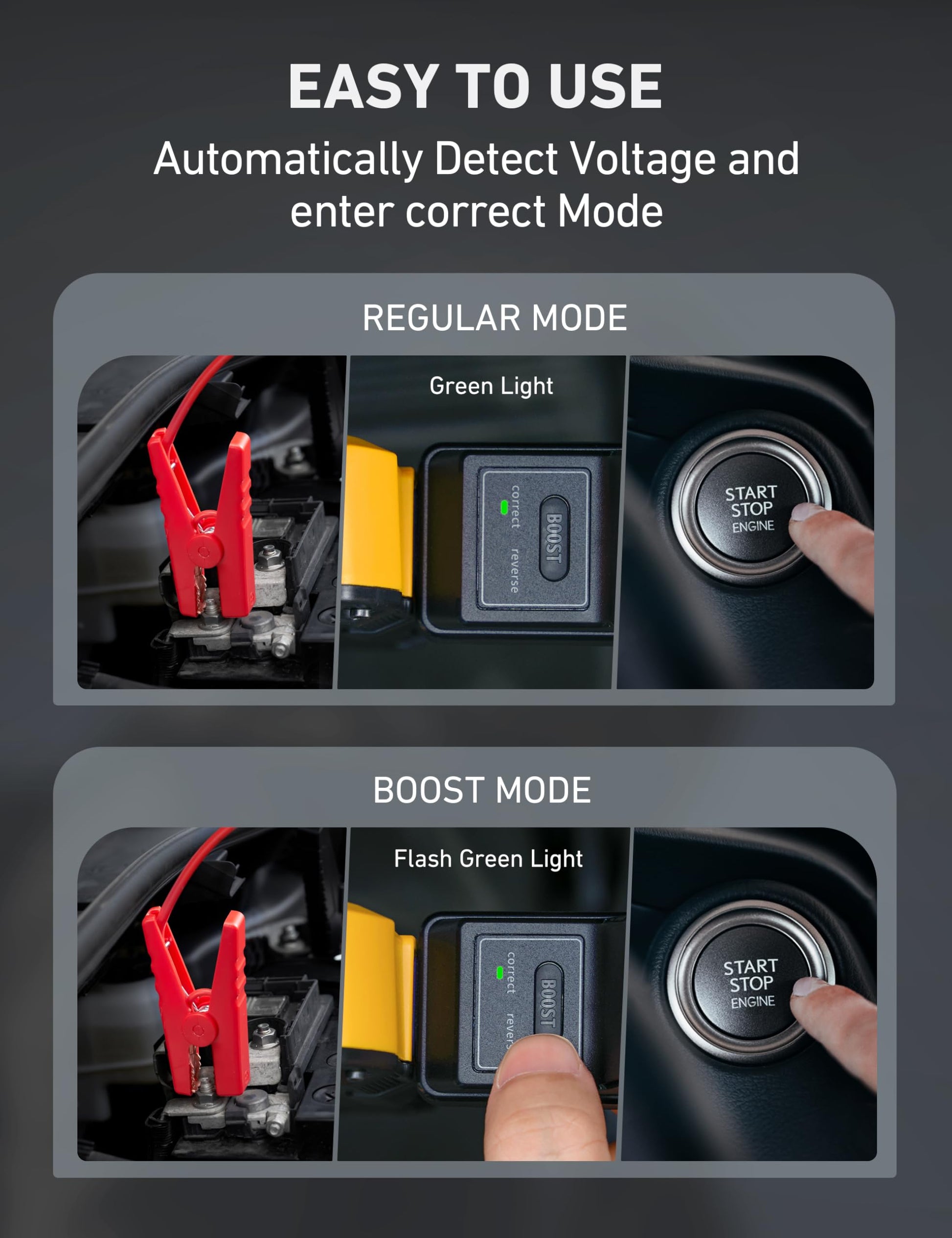 - ULTRA POWERFUL BOOST - The smart boost mode automatically detects the battery's voltage. When the voltage is less than 9 V, the indicator flashes green; this unlocks the "BOOST" button, which can be pressed to start fully-drained batteries.