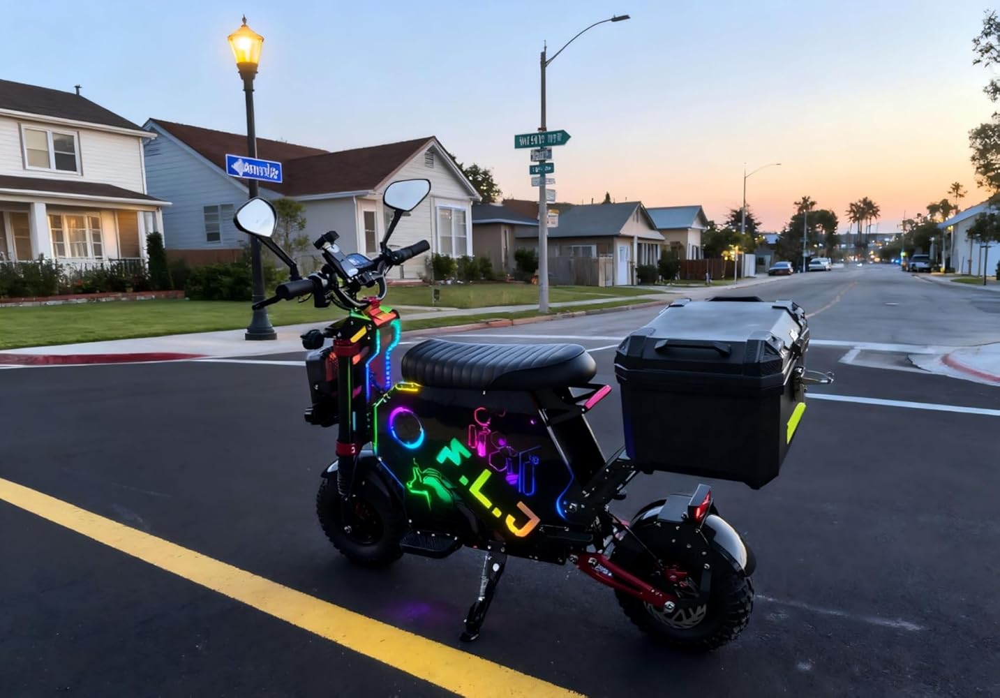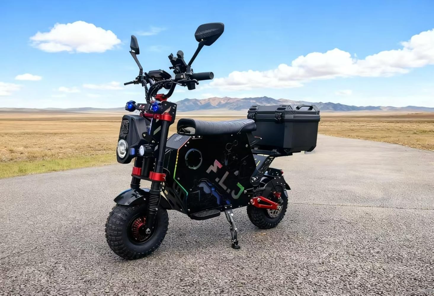 Extreme Speed & Power: Reach up to 55-75 MPH (90-120 km/h) with dual 5000W motors (10000W total). Long-Range Battery: Equipped with a 72V 50Ah removable lithium battery, providing 120-150 km (74-112 miles) per charge. Heavy-Duty Build: Supports up to 300kg load capacity, with a strong aluminum alloy frame. Off-Road Ready: 14-inch tubeless off-road tires with front hydraulic & rear spring shocks for a smooth ride. Smart Controls: NFC unlocking, APP integration, Bluetooth, password security, EBS braking, and one-button speed limit. Comfort & Style: Spacious 51cm seat, foldable design, acrylic side lights, RGB lighting, and multiple riding modes (Sport, Comfort, Eco). Premium Accessories Included: Trunk box, 2x 5A fast chargers, 2 pairs of pedals, and tool kit.